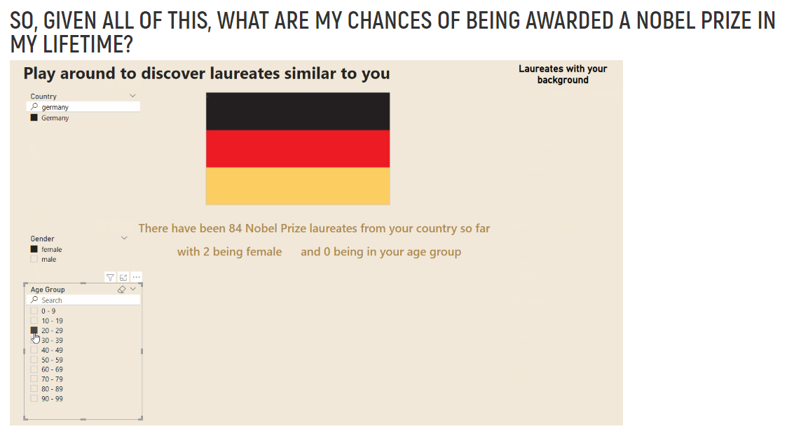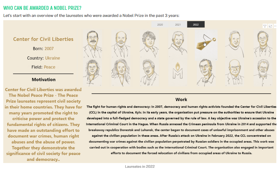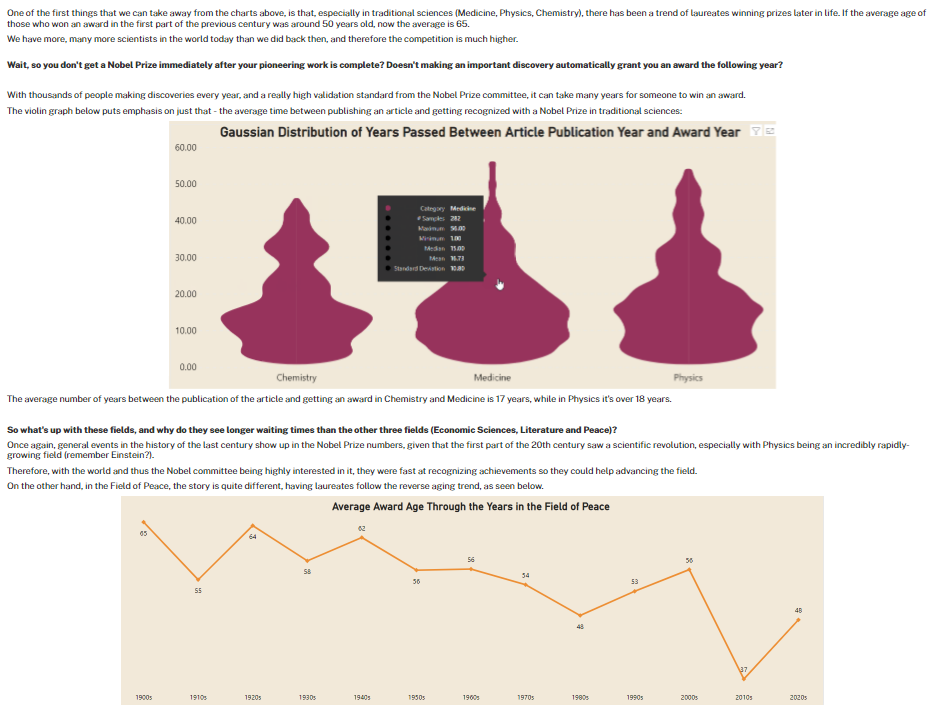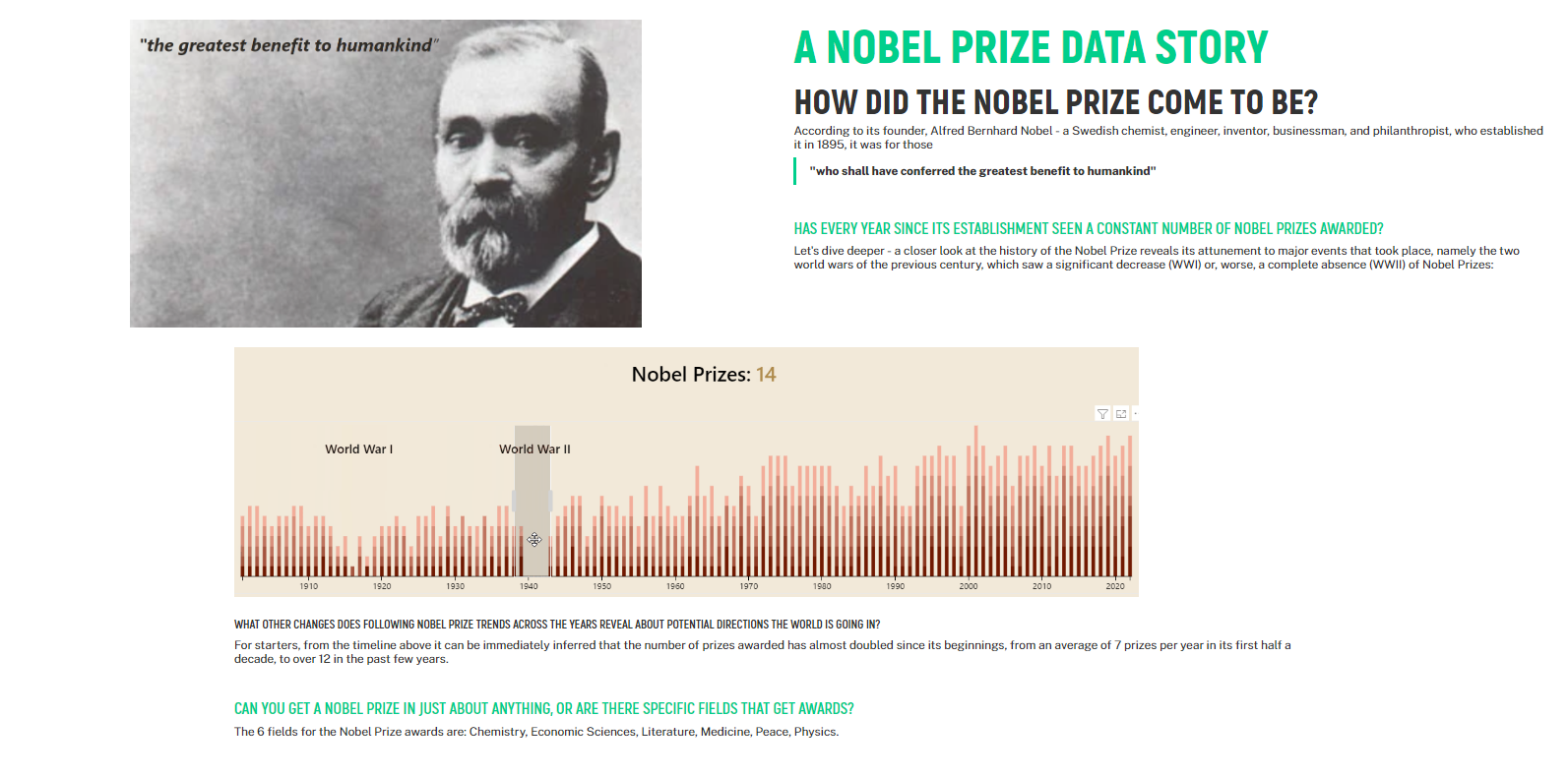 Something I've recently discovered, but already love, is storytelling with data. Having gained some experience as a data analyst with my previous employer, it was there where I started telling stories using data, which in turn made me fall in love with stories told both using words and visuals (be it data charts or illustrations). Here is the Nobel Prize story I told there, and below you can see a few screenshots from my work.